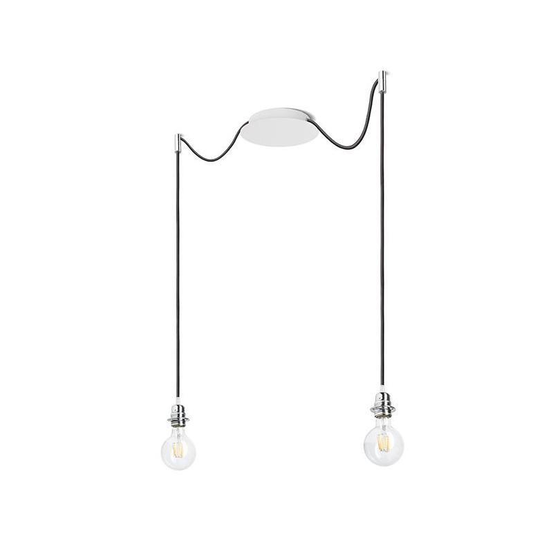 Zestaw wiszący z centralną sufitową podstawą z której wychodzą dwa tekstylne kable z metalową oprawką E27 mocowane odzielnie obok podstawy. Kable posiadają chromowe uchwyty pozwalające na umieszczenie ich na suficie w dowolnej odlegości od podstawy. Długość kabli 3 m. Polecane akcesoria: ARISTA DELI JAKARANDA DOUBLE 40/30 DOUBLE 55/30 ASPRO 40/30 ASPRO 55/30 RON 15/20 RON 40/25 RON 55/30 TEMPO 15/30 TEMPO 30/19.