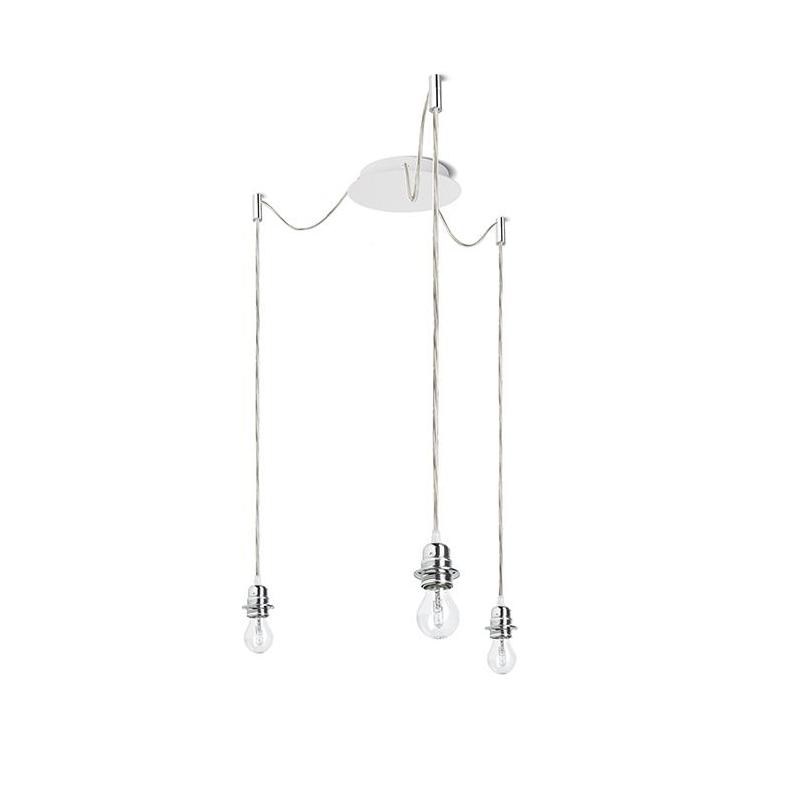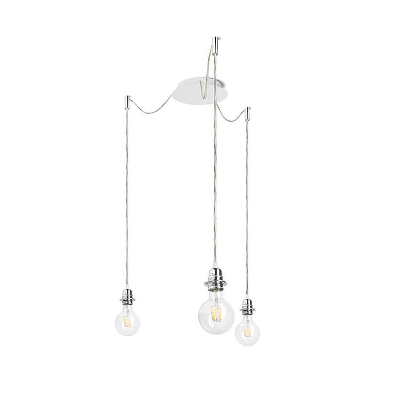 Zestaw wiszący z centralną sufitową podstawą z której wychodzą trzy kable tekstylne z metalową oprawką E27. Kable posiadają chromowe uchwyty pozwalające na umieszczenie ich na suficie w dowolnej odlegości od podstawy. Długość kabli 3 m. Polecane abażury: ARISTA DELI JAKARANDA DOUBLE 40/30 DOUBLE 55/30 ASPRO 40/30 ASPRO 55/30 RON 15/20 RON 40/25 RON 55/30 TEMPO 15/30 TEMPO 30/19.