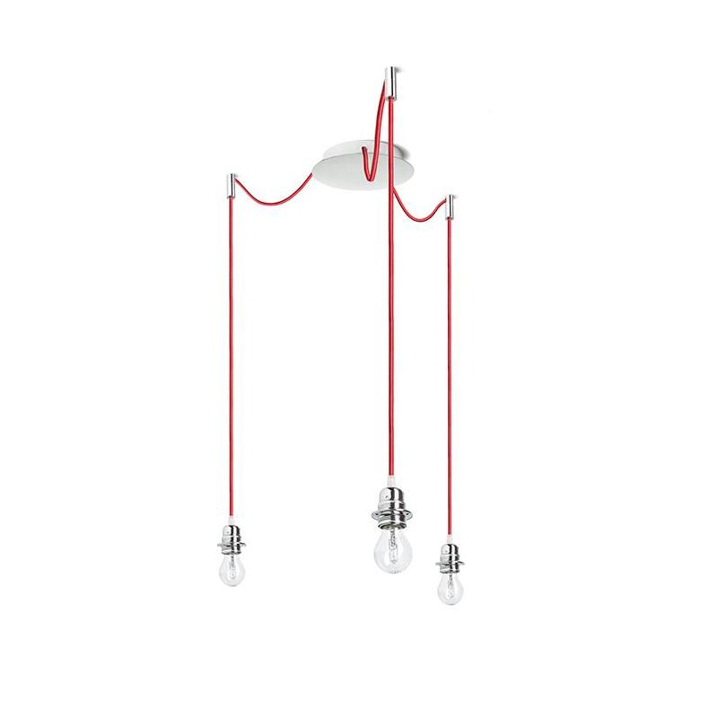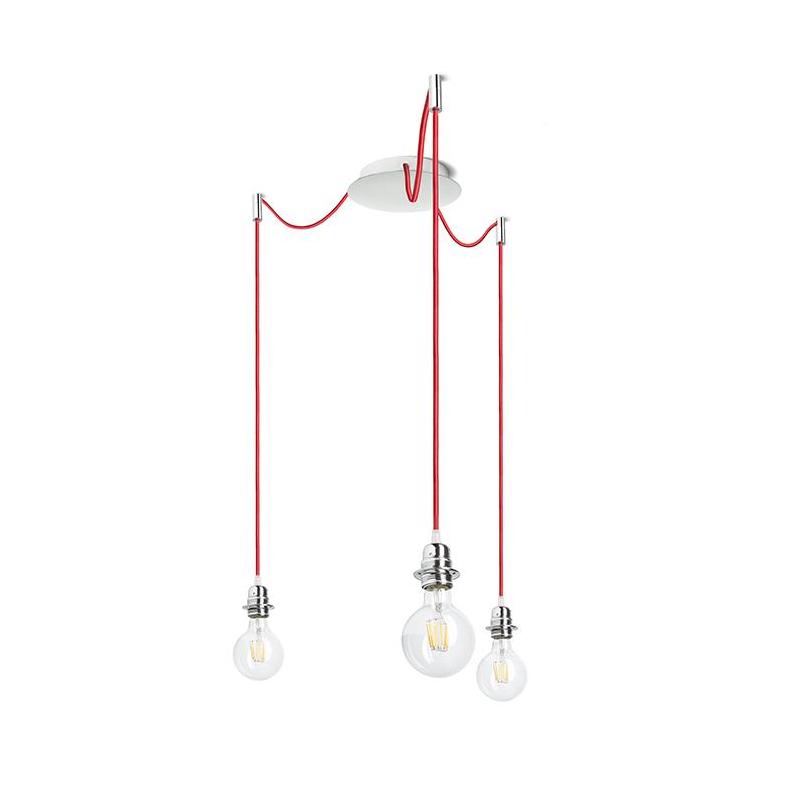 Zestaw wiszący z centralną sufitową podstawą z której wychodzą trzy kable tekstylne z metalową oprawką E27. Kable posiadają chromowe uchwyty pozwalające na umieszczenie ich na suficie w dowolnej odlegości od podstawy. Długość kabli 3 m. Polecane abażury: ARISTA DELI JAKARANDA DOUBLE 40/30 DOUBLE 55/30 ASPRO 40/30 ASPRO 55/30 RON 15/20 RON 40/25 RON 55/30 TEMPO 15/30 TEMPO 30/19.