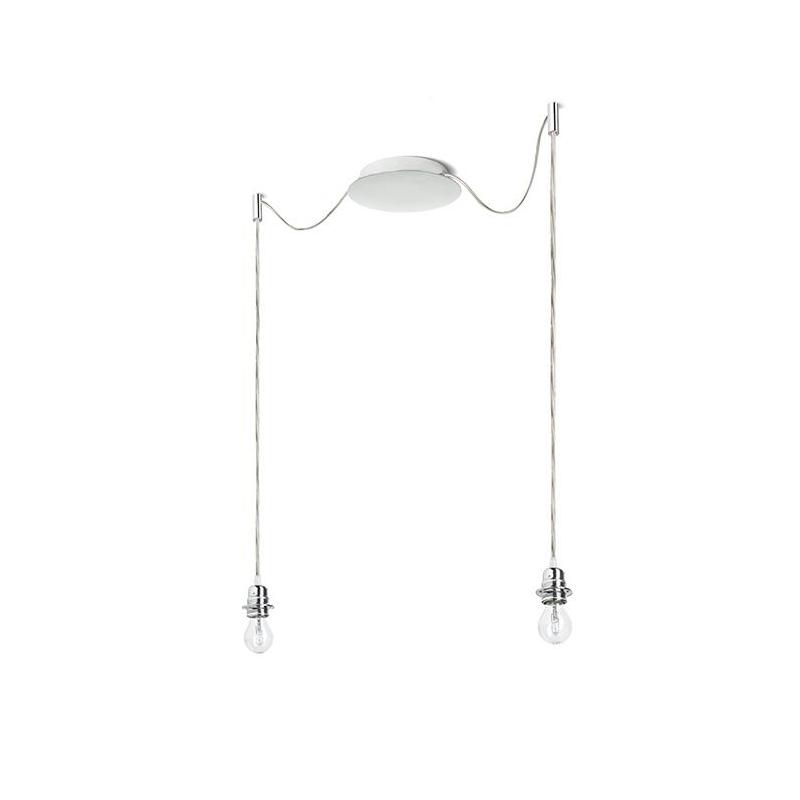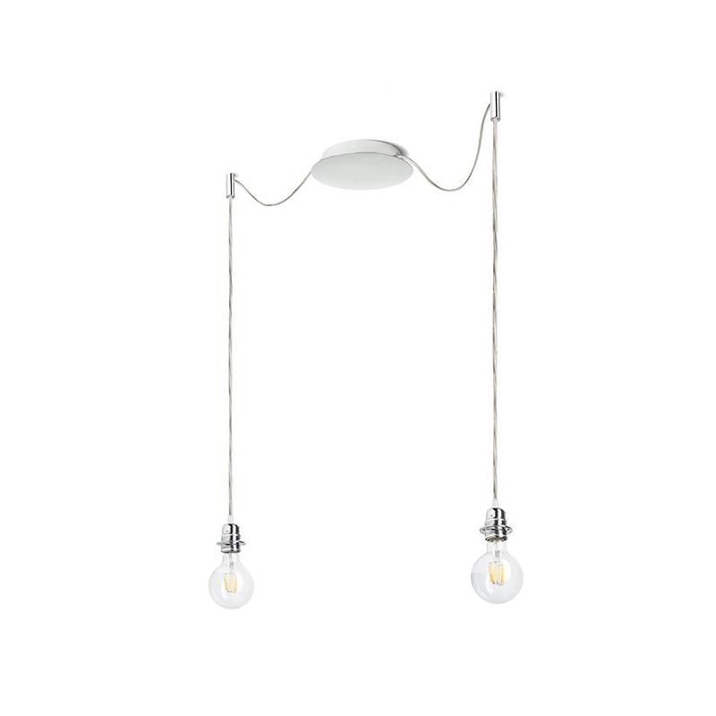 Zestaw wiszący z centralną sufitową podstawą z której wychodzą dwa tekstylne kable z metalową oprawką E27 mocowane odzielnie obok podstawy. Kable posiadają chromowe uchwyty pozwalające na umieszczenie ich na suficie w dowolnej odlegości od podstawy. Długość kabli 3 m. Polecane akcesoria: ARISTA DELI JAKARANDA DOUBLE 40/30 DOUBLE 55/30 ASPRO 40/30 ASPRO 55/30 RON 15/20 RON 40/25 RON 55/30 TEMPO 15/30 TEMPO 30/19.