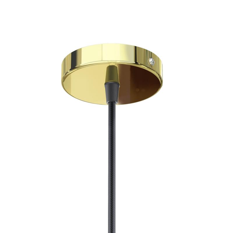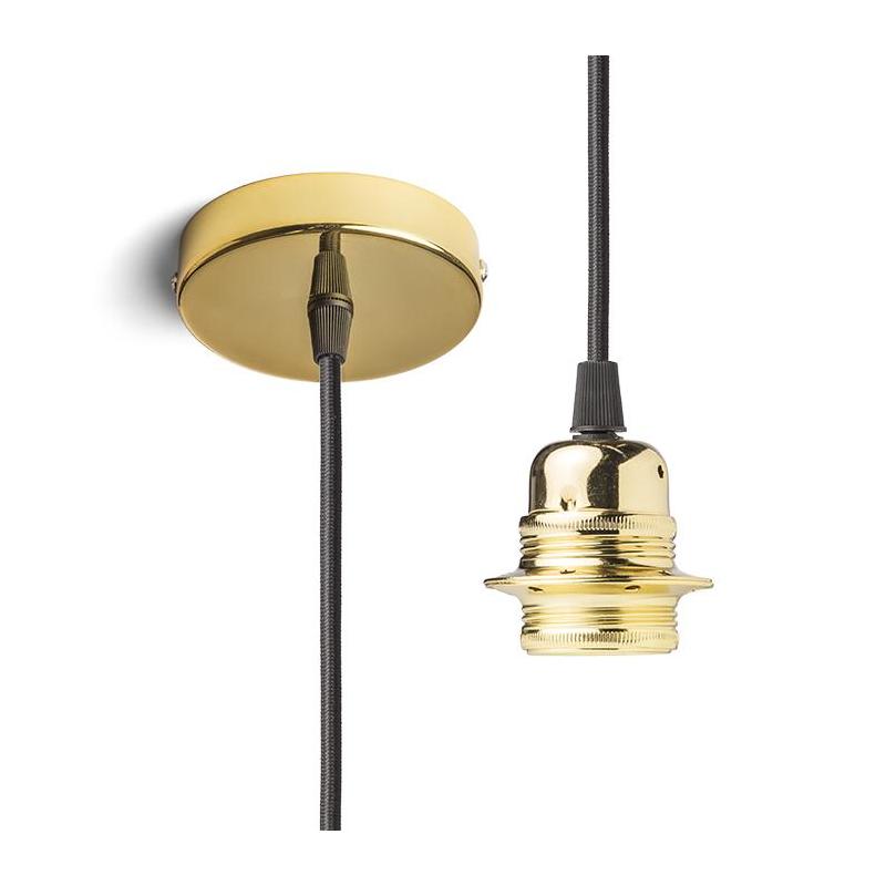 Zestaw wiszący z okrągłą złotą rozetą kablem tekstylnym i metalowym oprawką E27 przeznaczona do zawieszenia lekkich abażurów lub montażu tylko ze źródłem światła. Polecane akcesoria: ARISTA DELI JAKARANDA DOUBLE 40/30 DOUBLE 55/30 ASPRO 40/30 RON 40/25 RON 55/30 RON 60/19 TEMPO 30/19 TEMPO 50/19.