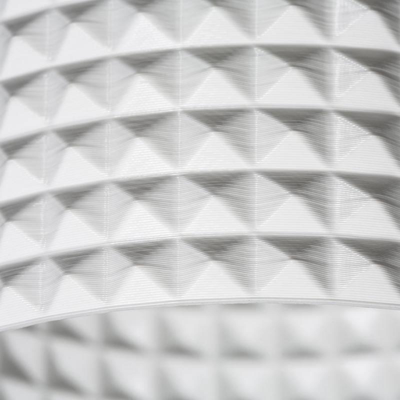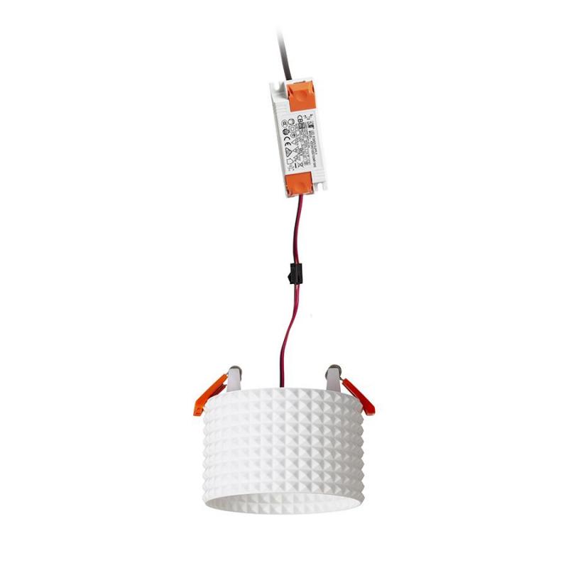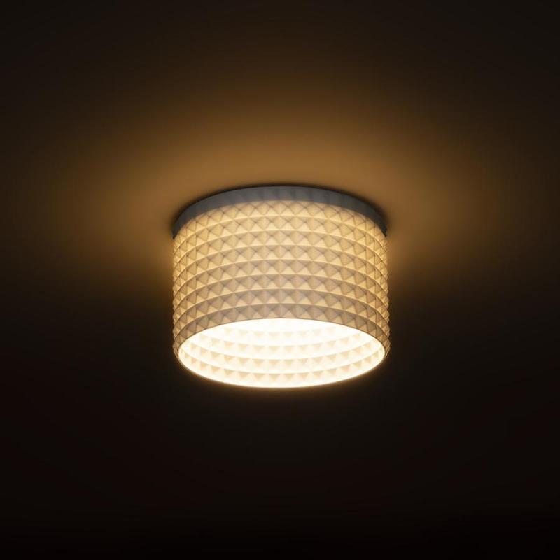 Oprawa LED do wbudowania w sufit z płyt gipsowo-kartonowych o małej głębokości wbudowania i dekoracyjnym kloszu. Klosz jest tworzony przez druk 3D. Wykonany z przyjaznego dla środowiska materiału PLA który jest w pełni degradowalny. Wielkość otworu montażowego można dobrać za pomocą przesuwnych sprężyn montażowych. W wygodny sposób można zastąpić istniejące żarówki halogenowe lampami bez konieczności regulacji otworów montażowych.