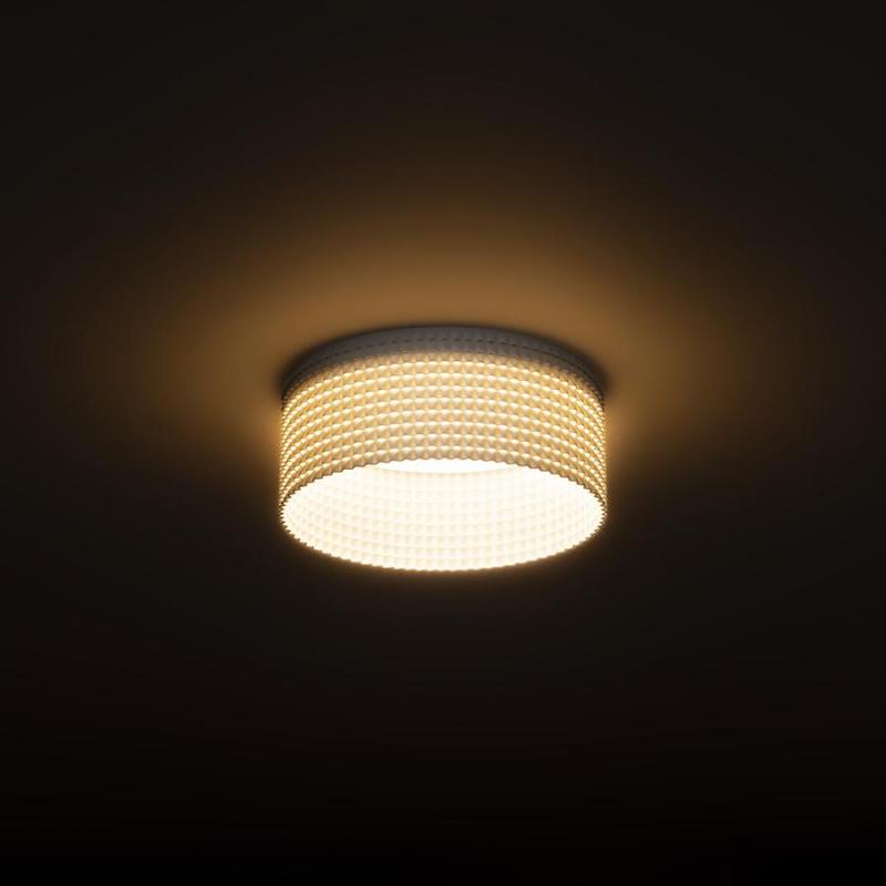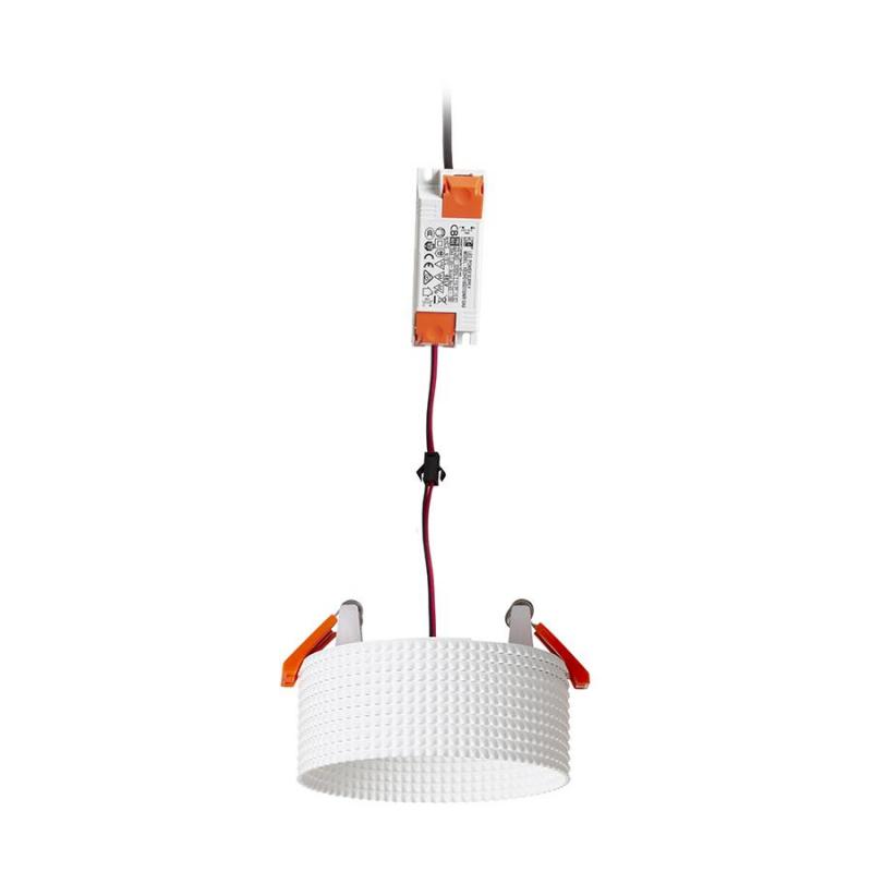 Oprawa LED do wbudowania w sufit z płyt gipsowo-kartonowych o małej głębokości wbudowania i dekoracyjnym kloszu. Klosz jest tworzony przez druk 3D. Wykonany z przyjaznego dla środowiska materiału PLA który jest w pełni degradowalny. Wielkość otworu montażowego można dobrać za pomocą przesuwnych sprężyn montażowych. W wygodny sposób można zastąpić istniejące żarówki halogenowe lampami bez konieczności regulacji otworów montażowych.