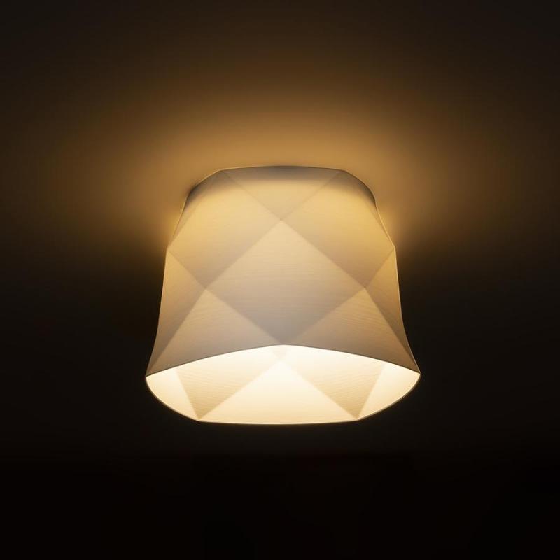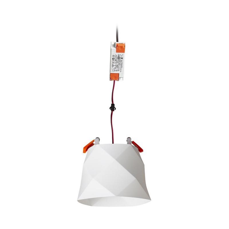 Oprawa LED do wbudowania w sufit z płyt gipsowo-kartonowych o małej głębokości wbudowania i dekoracyjnym kloszu. Klosz jest tworzony przez druk 3D. Wykonany z przyjaznego dla środowiska materiału PLA który jest w pełni degradowalny. Wielkość otworu montażowego można dobrać za pomocą przesuwnych sprężyn montażowych. W wygodny sposób można zastąpić istniejące żarówki halogenowe lampami bez konieczności regulacji otworów montażowych.