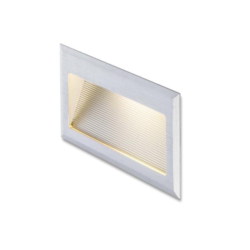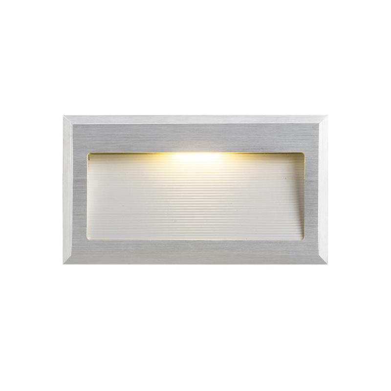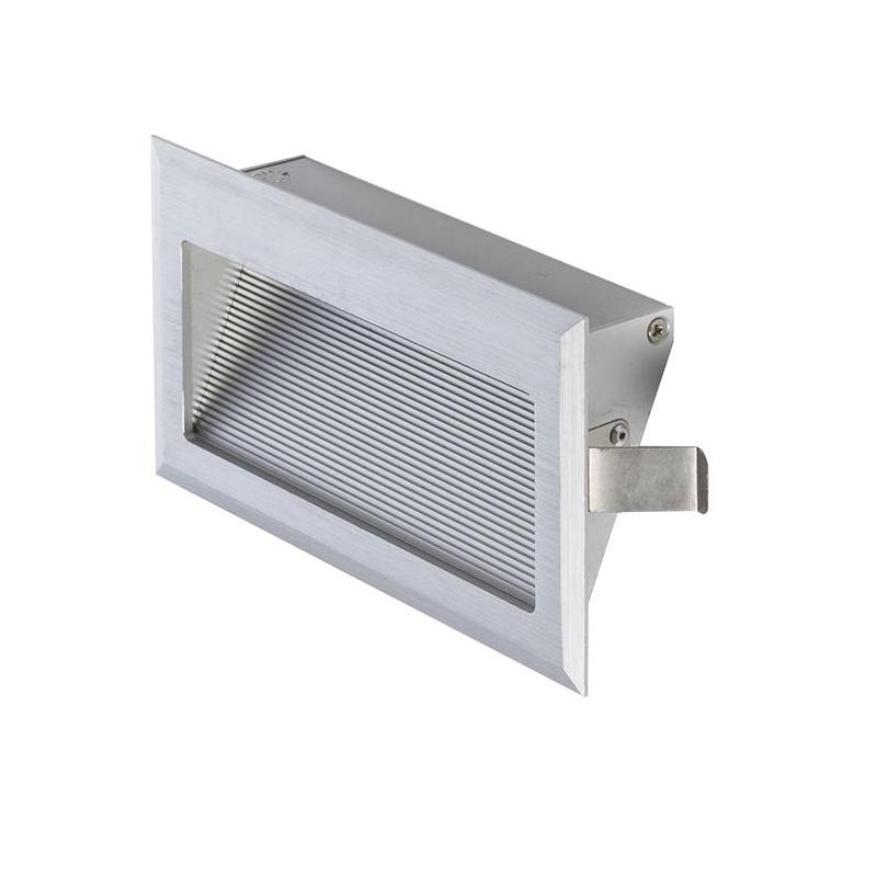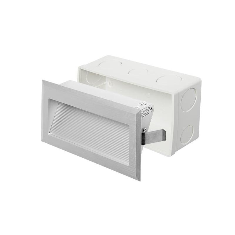Oprawa ścienna wpuszczana prostokątna z aluminium szczotkowanego z wbudowaną diodą COB LED. Grubość przedniej płyty wynosi 03 cm. Produkt jest dostarczany z puszką montażową. Tylko do połączenia szeregowego. Należy dokupić odpowiedni transformator.