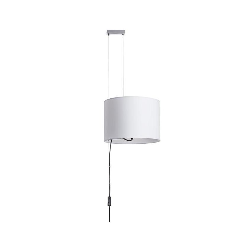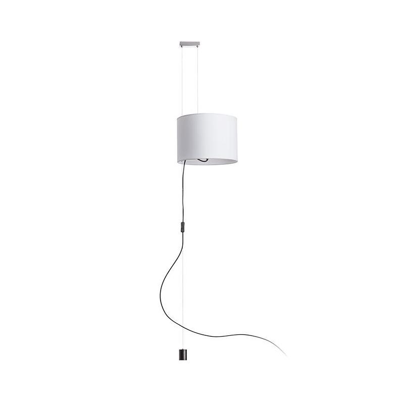 Lampa wisząca z przesuwanym abażurem na lince oraz kablem zakończonym wtyczką odpowiednia do montażu na suficie w miejscach bez przewodu zasilającego. Abażur jest pokryty materiałem ze strukturalnym wzorem. Wyłącznik znajduje się na kablu.
