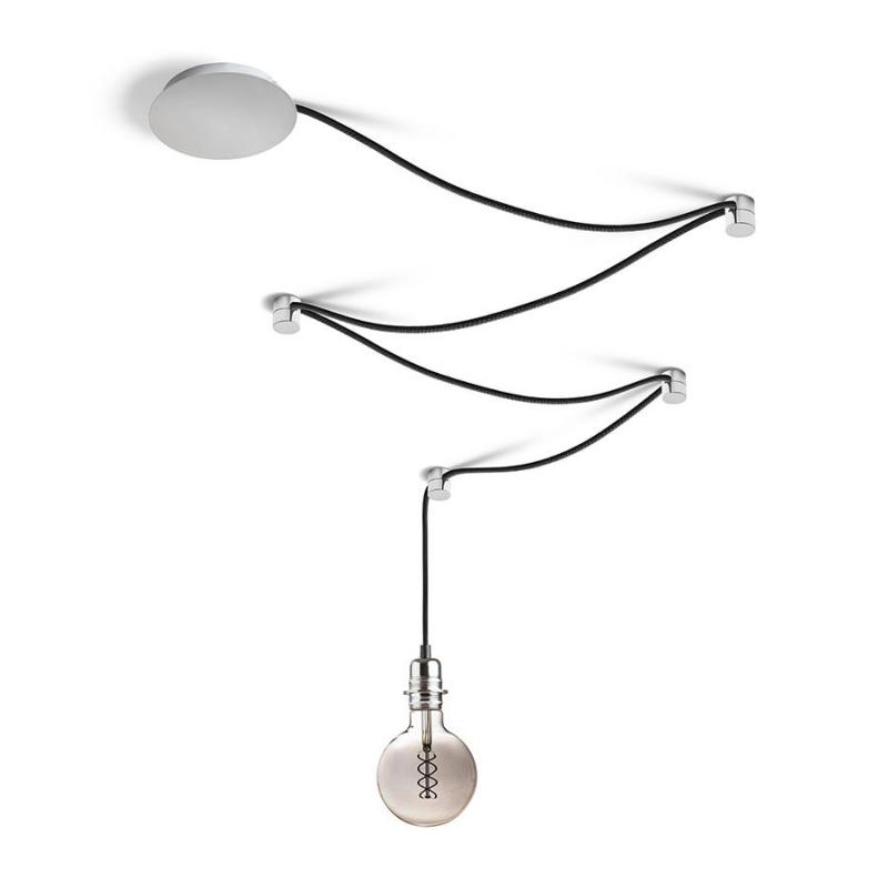 Zmienny zestaw odpowiedni do samodzielnego użytku z designerską żarówką lub kloszami lamp wiszących. Zestaw można przymocować do sufitu lub ściany za pomocą uchwytów umieszczonych na czarnym tekstylnym kablu. Zestaw zawiera 4 sztuki czarnych plastikowych uchwytów lub 4 metalowe chromowane uchwyty. Uchwyty można również zamówić osobno. Pasuje do abażurów: ARISTA ASPRO DOUBLE JAKARANDA RON.